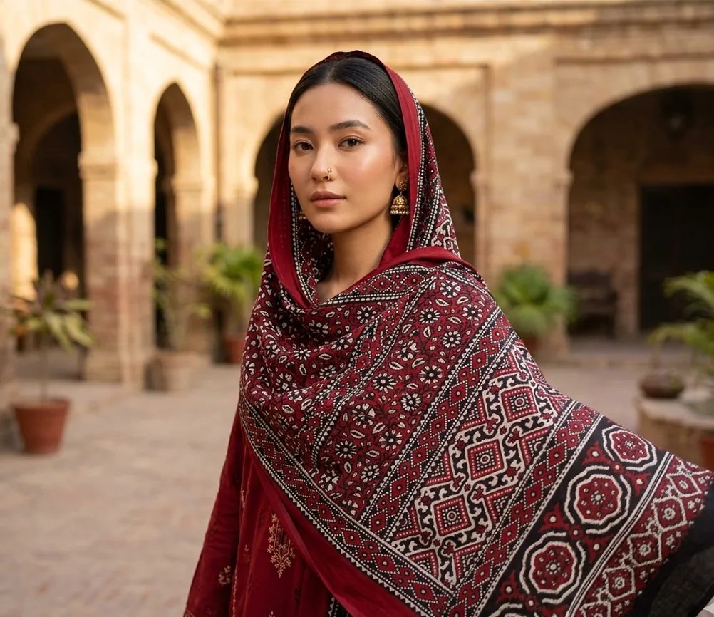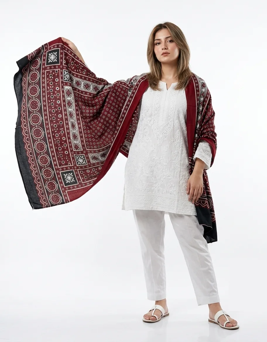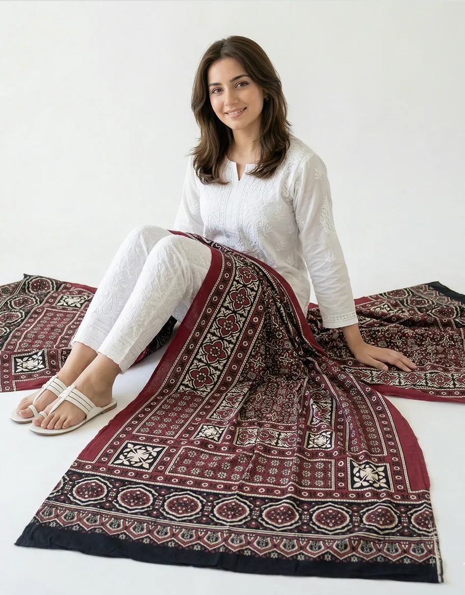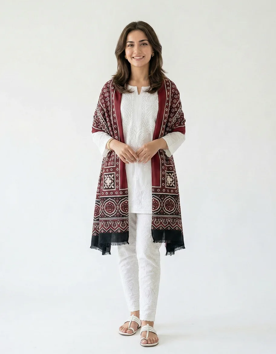 Crafted from premium fabric for a wonderfully soft feel and a flawless drape, this shawl brings effortless sophistication and heritage to any outfit. Due to the rich, traditional nature of Ajrak craftsmanship, the intricate geometric pattern you receive may vary slightly from the image. Ensuring your piece is beautifully unique to you. However, we absolutely guarantee that the rich Maroon and Black colors, premium quality, and elegant drape are exactly what you expect.