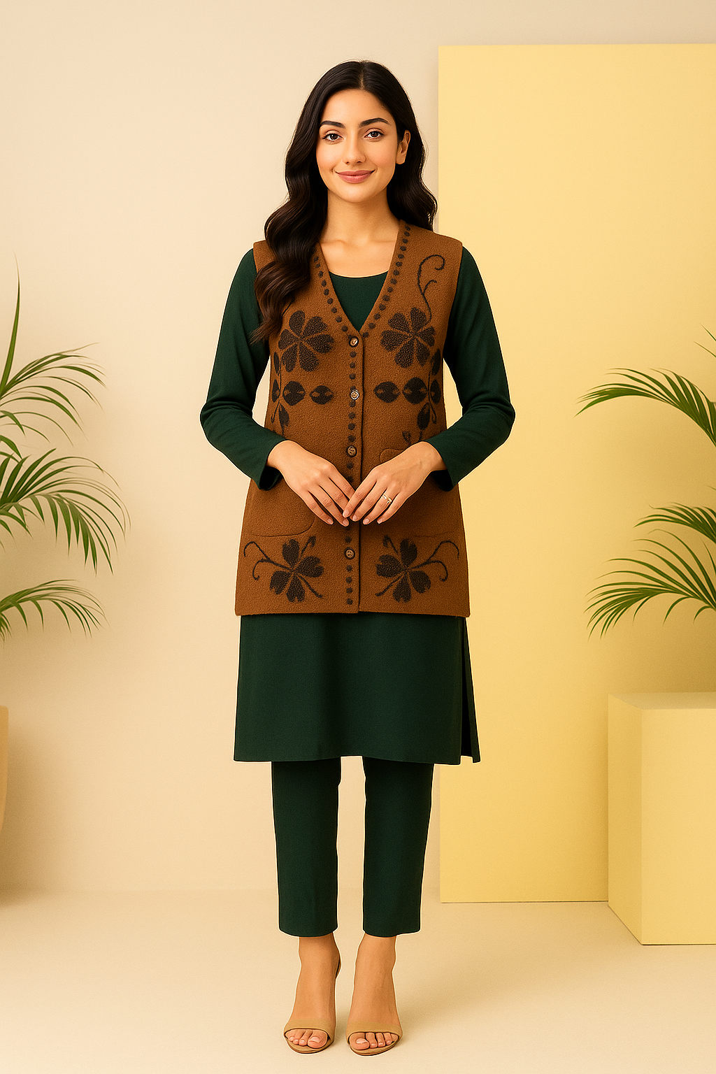 Add A Touch Of Refined Charm To Your Winter Outfits With Our Chestnut Brown Wool-Blend Floral Sweater. Featuring Intricate Black Floral Embroidery And Delicate Bead Accents, This Sleeveless Design Blends Warmth With Effortless Elegance. The Premium Wool-Blend Fabric Offers Cozy Comfort, While The Gold-Tone Buttons Enhance Its Luxurious Appeal. Perfect For Layering Over Kurtas, Or Dresses For Casual Wear Or Festive Gatherings.