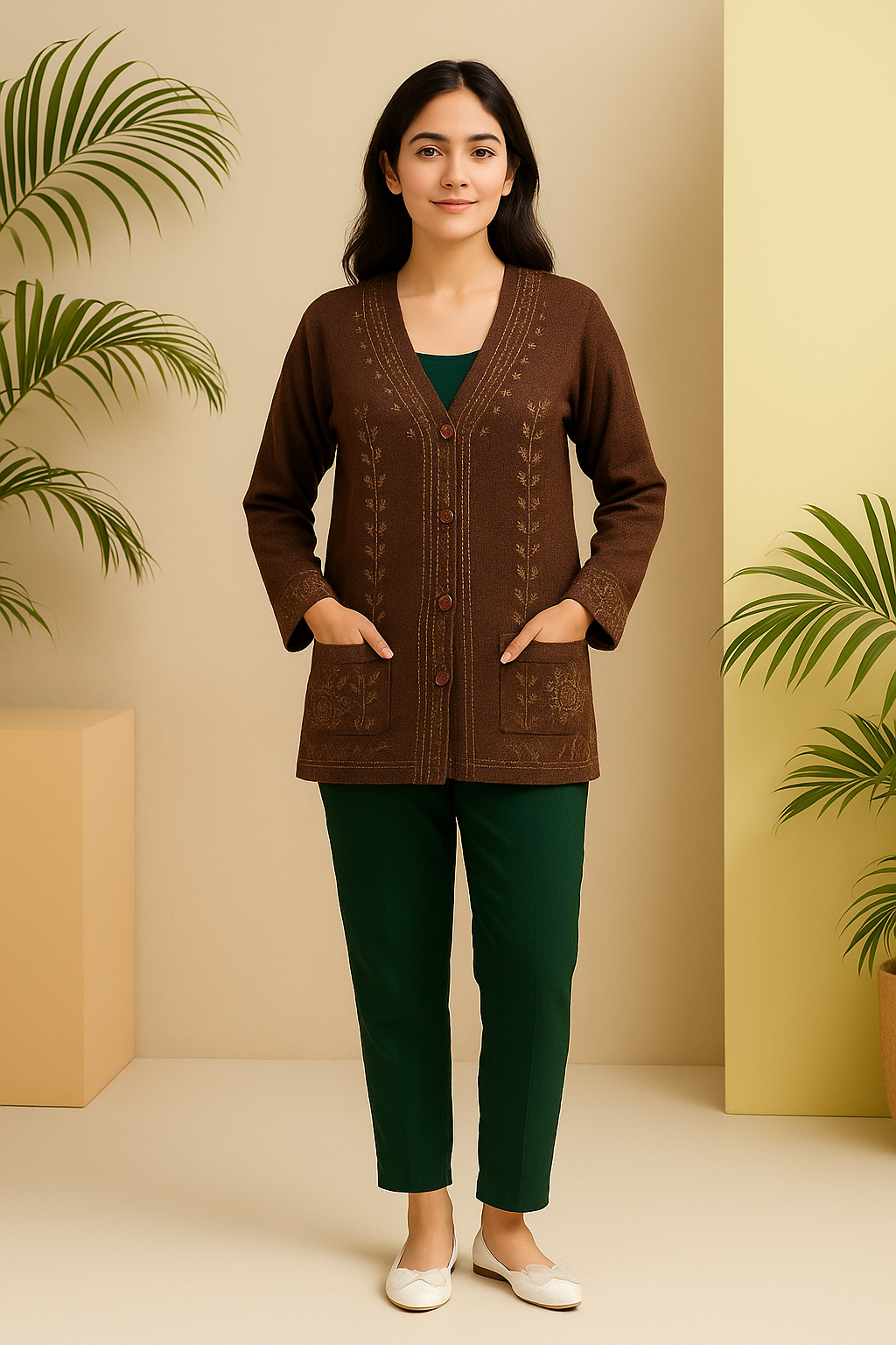 Embrace Timeless Elegance With Our Deep Mocha Wool-Blend Cardigan, Designed To Keep You Warm While Adding A Refined Touch To Your Winter Outfits. Crafted From Soft, Premium Wool-Blend Fabric, This Cardigan Showcases Intricate Golden Embroidery Along The Neckline, Sleeves, And Front Panels, Creating A Graceful And Versatile Look Suitable For Both Casual And Dressy Occasions. Its Flattering Cut And Cozy Texture Make It A Must-Have For The Season.