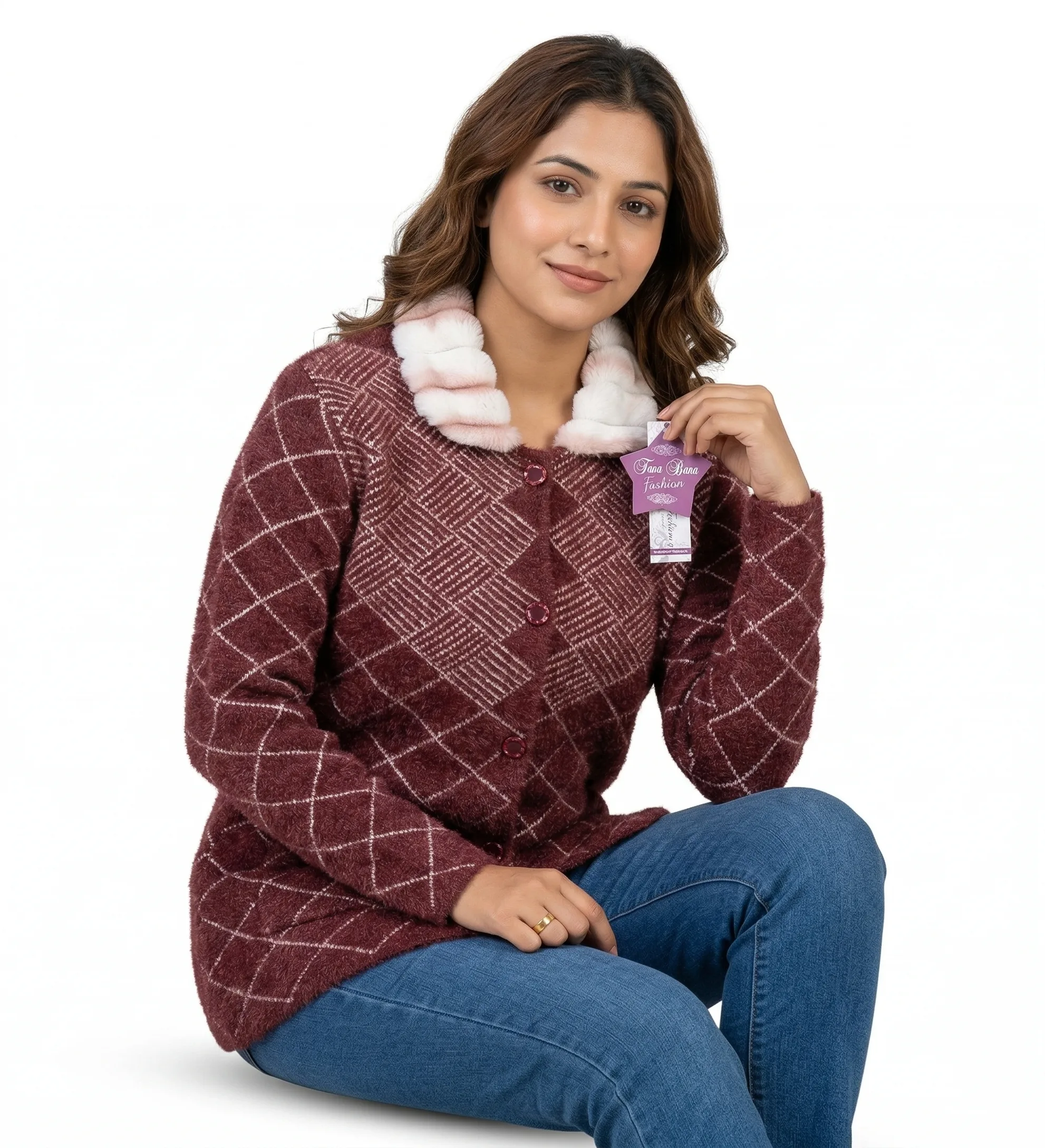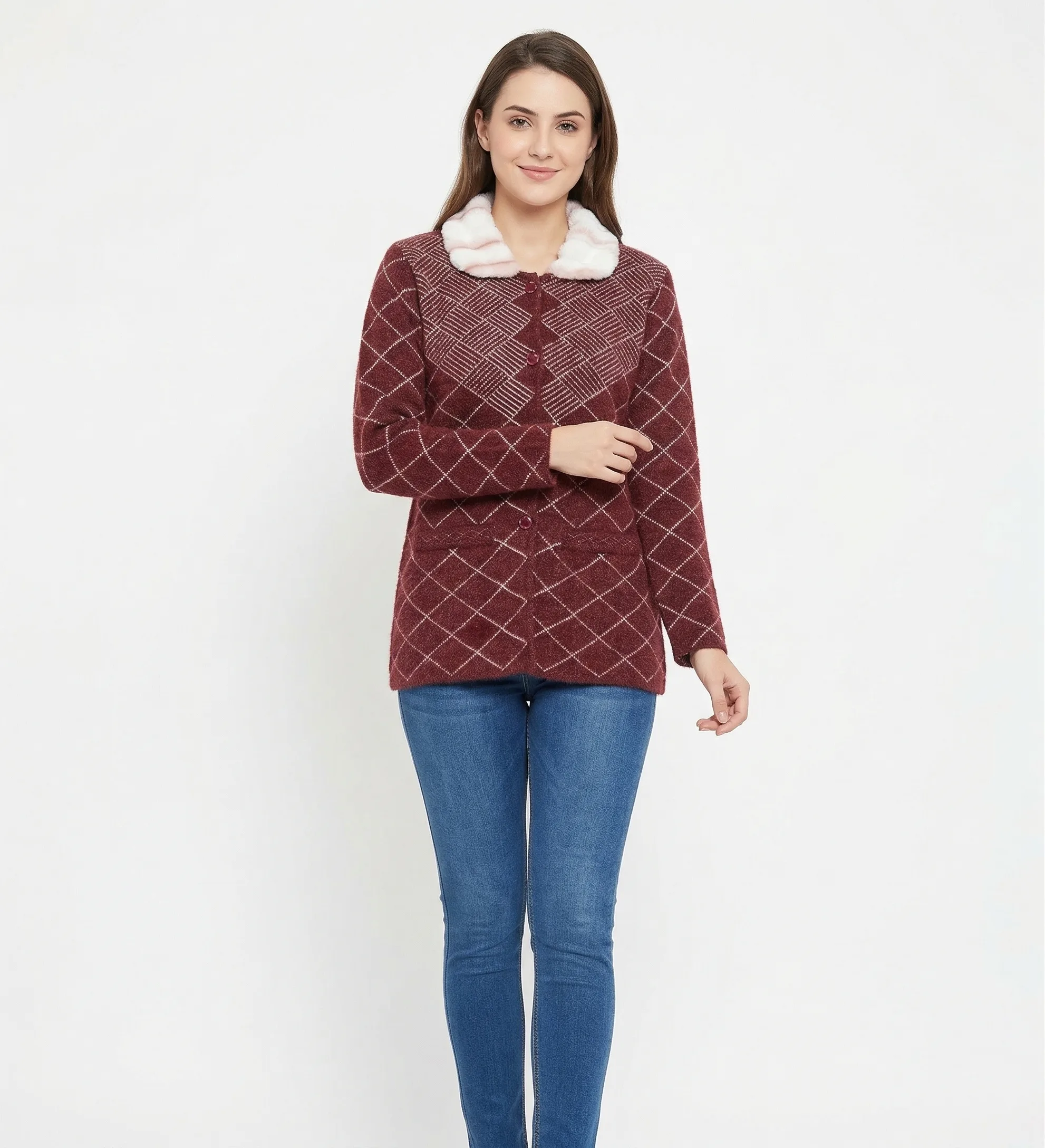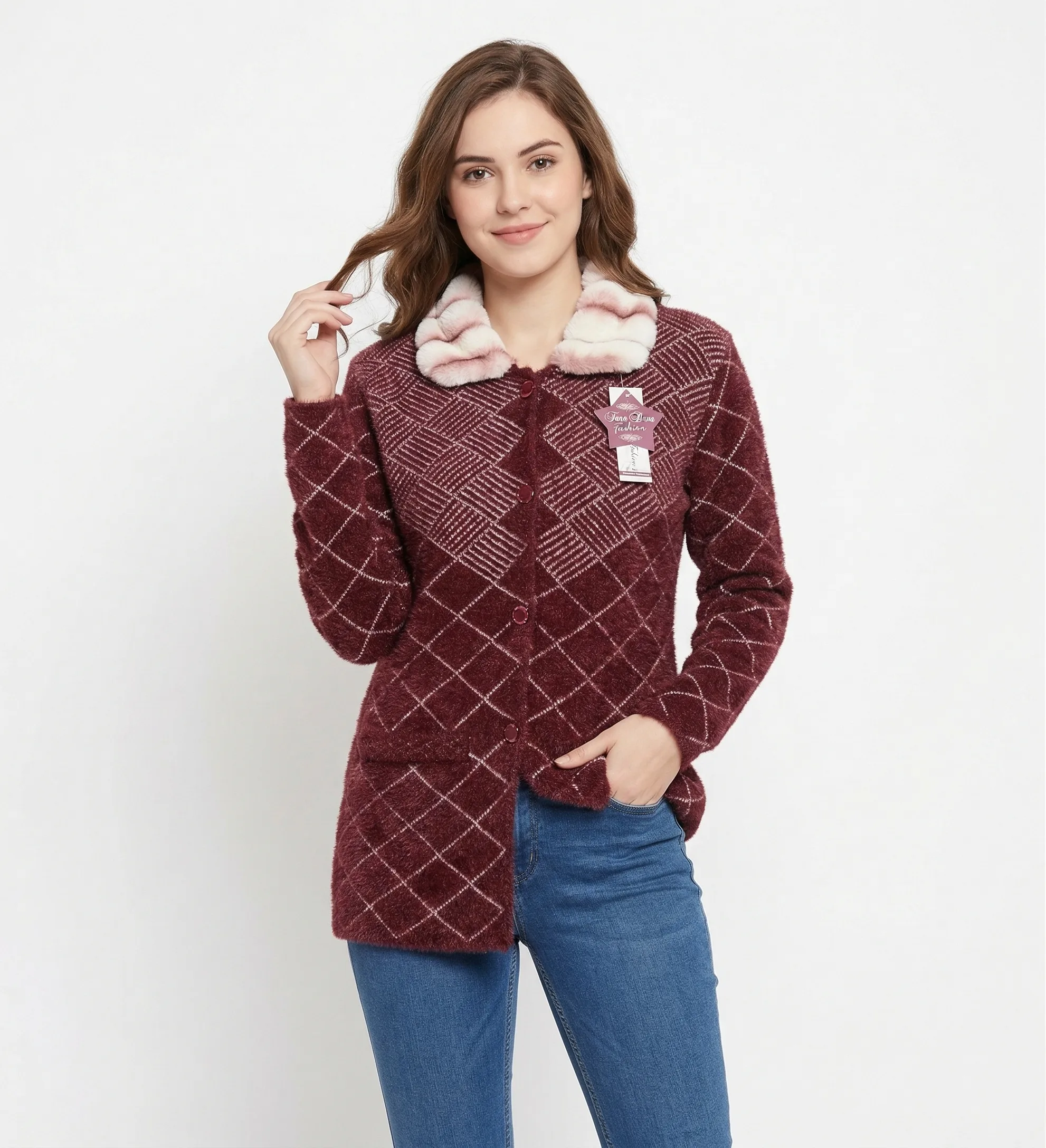 Wrap yourself in luxurious warmth with this cozy burgundy cardigan, featuring a soft faux-fur collar and a beautiful diamond knit pattern.