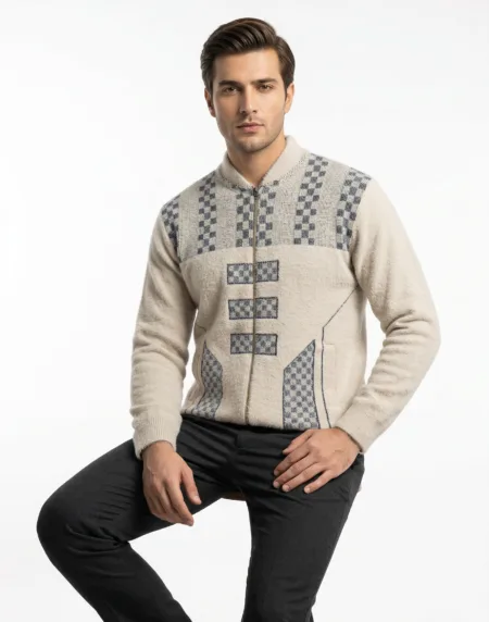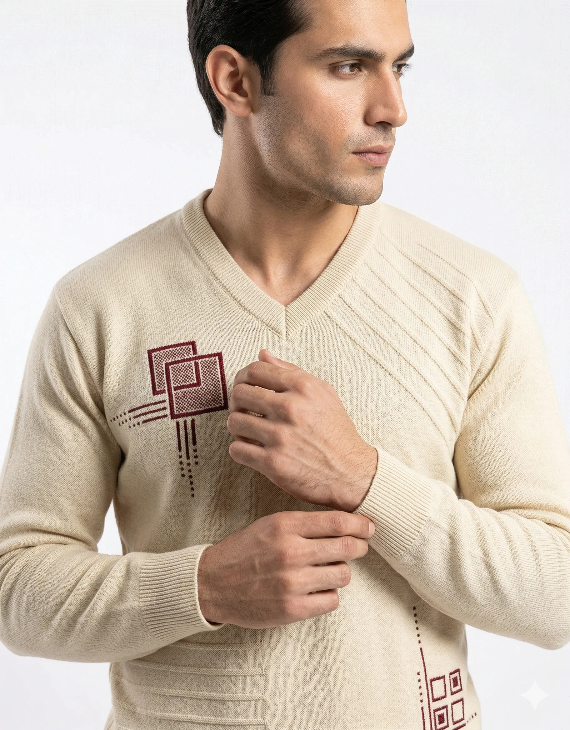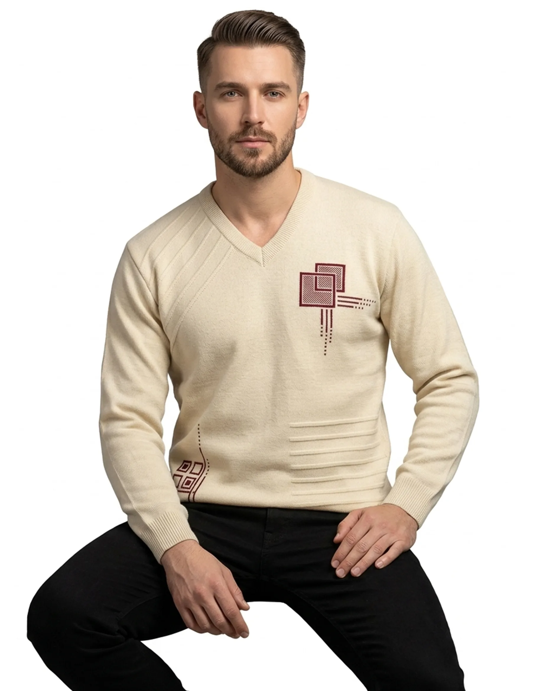 Geometric Heritage V-Neck Men’s Sweater – Cream