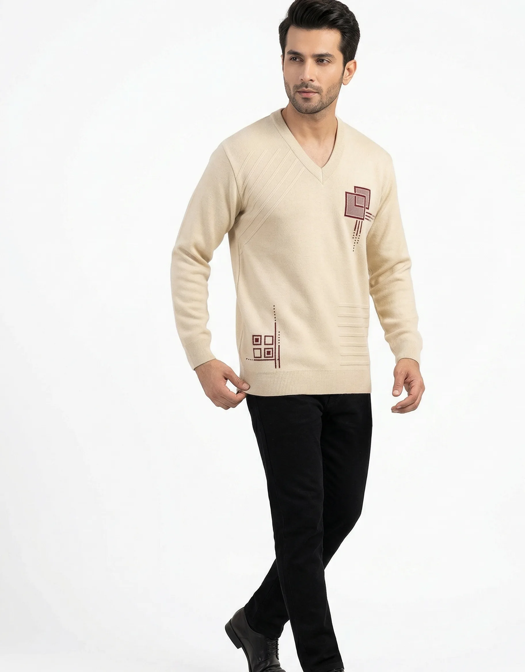 Stay warm and look sharp with this modern cream V-neck sweater, featuring a stylish geometric pattern perfect for everyday wear.