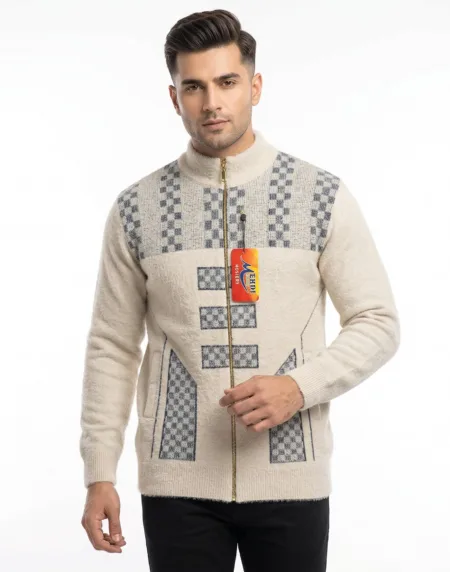 Geometric Checkerboard Plush Zip-Up Sweater — Cream