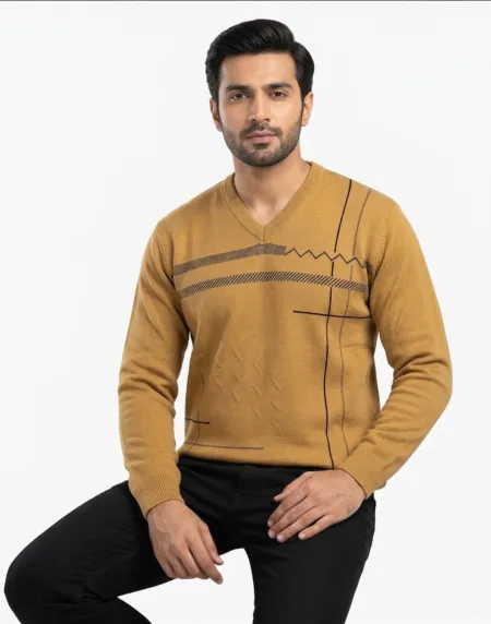 Abstract Linear Fine Knit V-Neck Sweater — Mustard