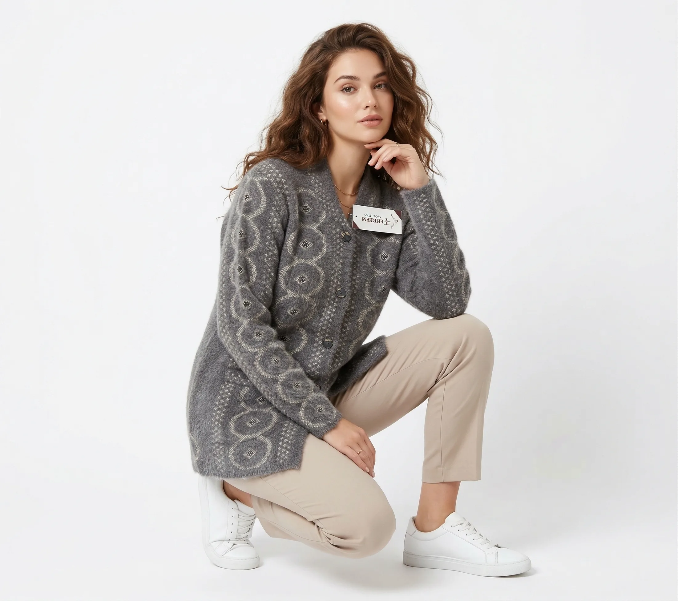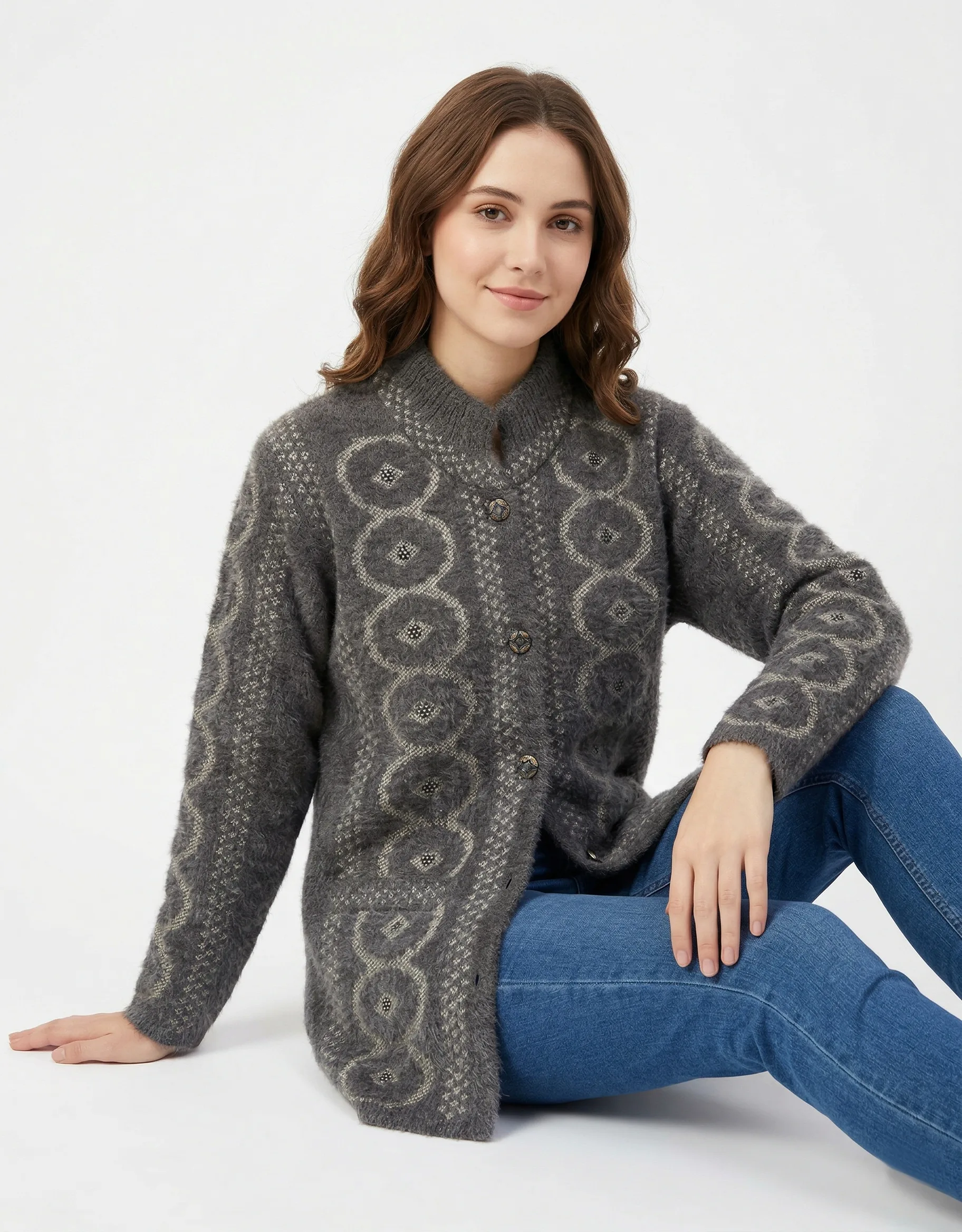 Retro Jacquard Longline Cardigan – Slate Gray