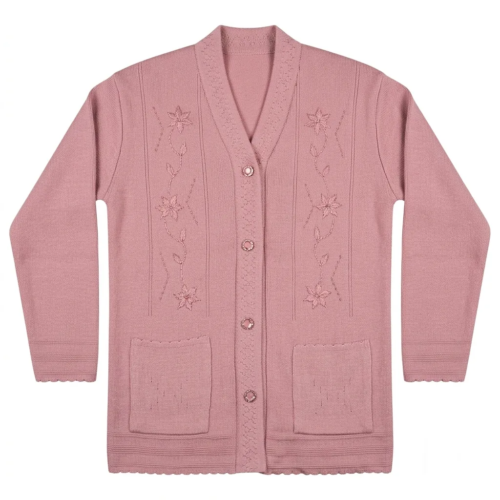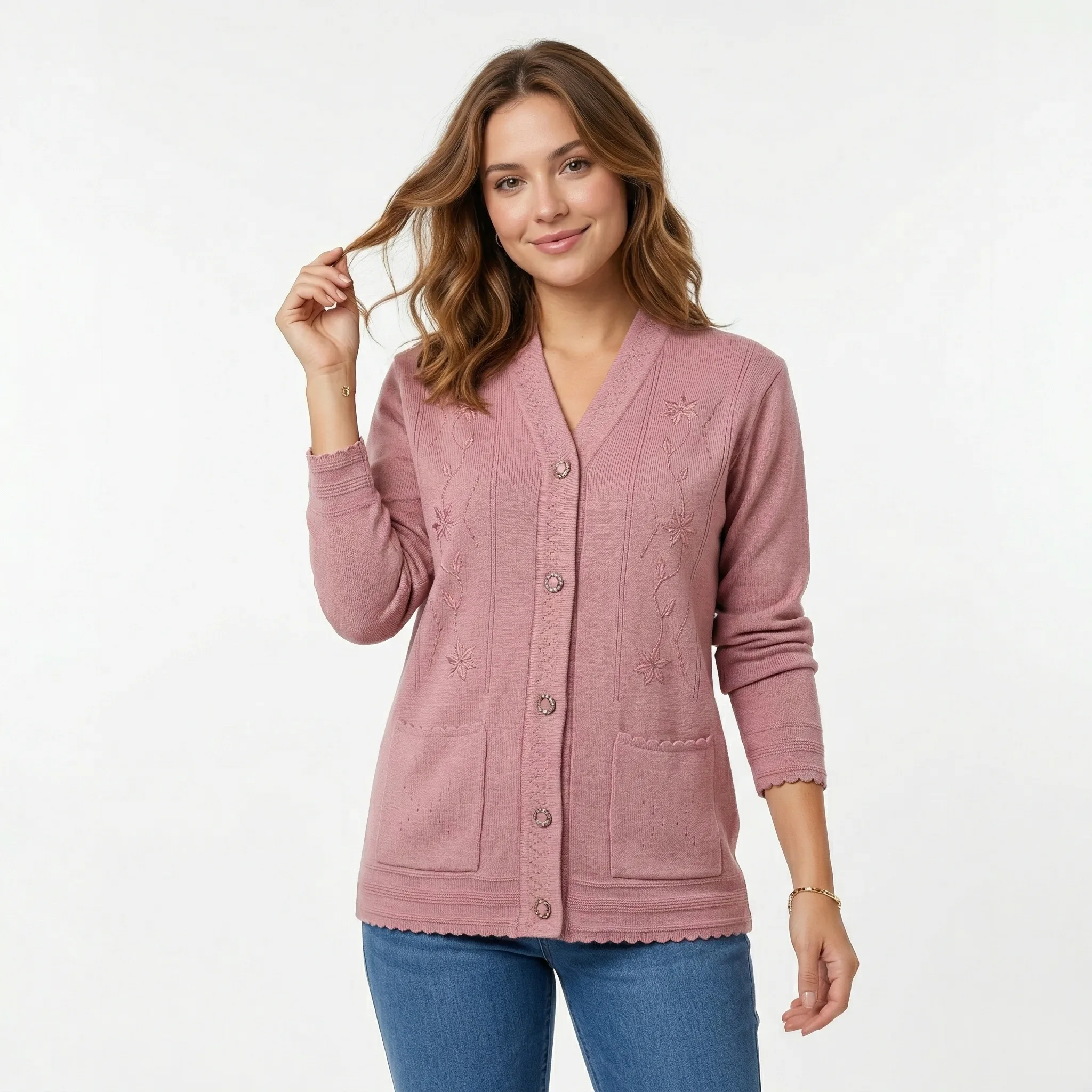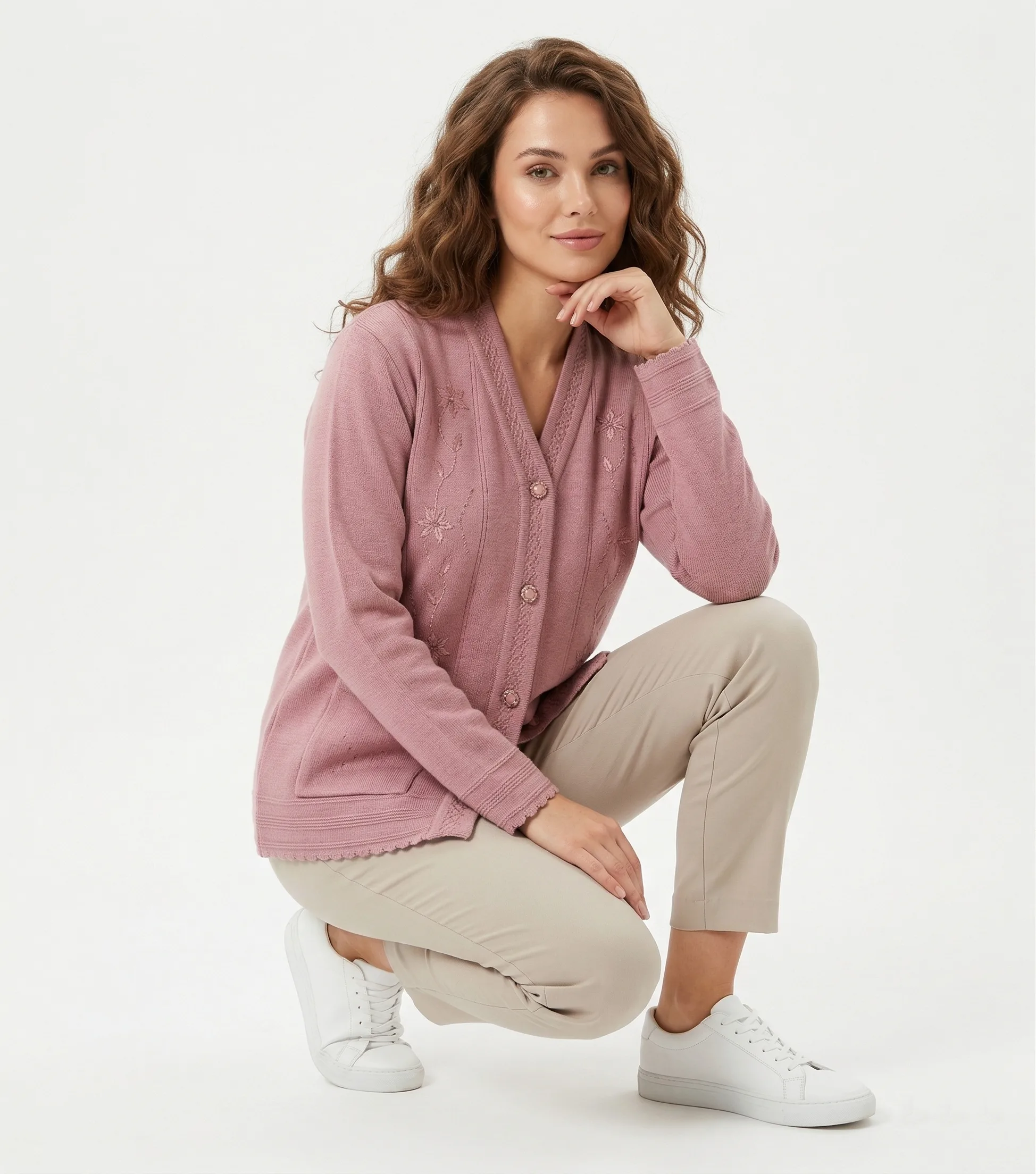 Welcome the season with this soft blush v-neck cardigan, featuring delicate floral touches for a fresh and beautifully feminine everyday look.