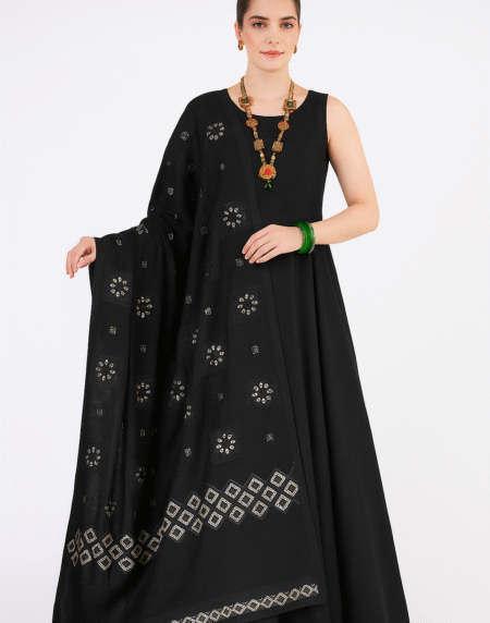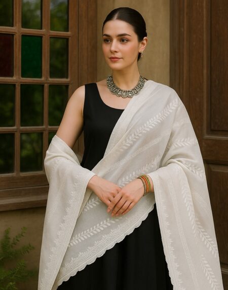 Turn heads with this Jet Black Chikankari Embroidery Shawl, beautifully designed with intricate embroidery and a delicate net border. A graceful, lightweight piece perfect for formal events, gatherings, or modest everyday style.